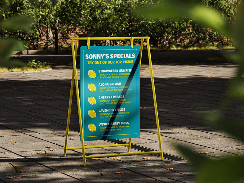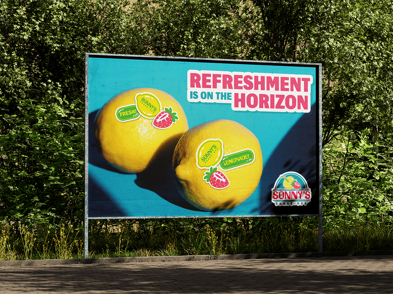 This branding concept was created in order to build a vibrant and colorful visual identity for Sonny’s Shake-Ups, a food truck selling lemonade and other refreshing mixed drinks. The bright color palette was developed with summer and freshness in mind, as well as to help the truck stand out in a crowd. Sticker motifs were also used, inspired by stickers you would find on fresh fruit.